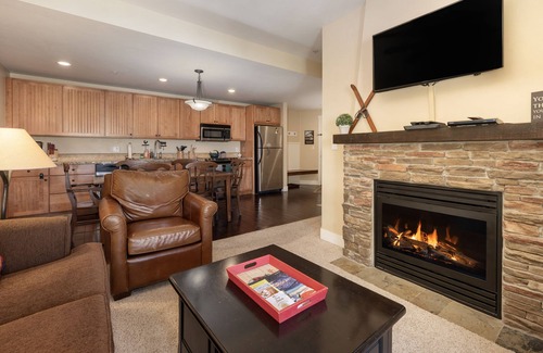 Condo is a 650 sq ft one-bedroom with queen master bedroom, queen bed pullout sofa, 1 pack n play crib, one full spacious bathroom (separate shower & tub), and high ceilings (top floor unit). Completely furnished kitchen and full-size appliances. Kid friendly items: cabinet locks, outlet covers, baby gate, baby monitor, booster chair, kid toilet, clip-on table baby seat. Wifi included, 40" Smart TV in living room, 32" TV & air conditioning in master bedroom (which is unlike most other one-bedroom units in the building). Head out for a meal at the lodge or stay in to cook a family meal - brand new gas grill provided. Washer & dryer included in the unit. Heated underground parking for one car per condo unit. Elevator - no stairs needed to access the condo unit.