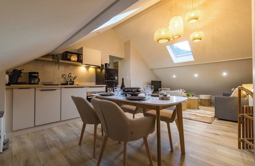 The living room includes a comfortable queen-size sofa bed (160 x 200 cm), perfect after a ski outing or cycling adventure. The open-plan kitchen is fully equipped with a fridge, oven, microwave, dishwasher, filter and pod coffee machines, raclette set, kettle, and toaster. A Smart TV is available to follow the news or stream your favorite content.