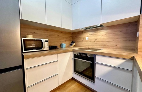 About SkiCity apartment: Interior equipment and comfort: 1. Bedroom (1): One bedroom with a double bed (180 x 200 cm) is available to guests. 2. Living room: The apartment includes a living room with a pull-out sofa bed, providing a pleasant place to socialise and relax. 3. The fully equipped kitchen in the apartment provides guests with all the necessary utilities for preparing meals, contributing to the comfort of a longer stay. The included equipment, such as a dishwasher, microwave, toaster and oven, add functionality and allow guests greater freedom in food preparation. 4. The bathroom includes all necessary equipment, including a bathtub, a hair dryer and a washing machine. 5. The spacious balcony with a view of the forest and mountains is a great addition to the apartment. The balcony can be ideal for relaxing, drinking coffee or tea, and observing nature. 6. 2 x flat screen TVs: in the bedroom and living room, providing the option to watch different channels at the same time. 7. Custom wood furnishing means that furniture and other interior solutions are adapted to the specifics of the space, creating a unique atmosphere. 8. A quality bed, mattresses and a pull-out sofa bed are essential for ensuring a good night's sleep and rest after sports activities. 9. SkiCity accommodation offers high-quality lodgings for four adult guests or families. 10. All living spaces provide a view of nature.