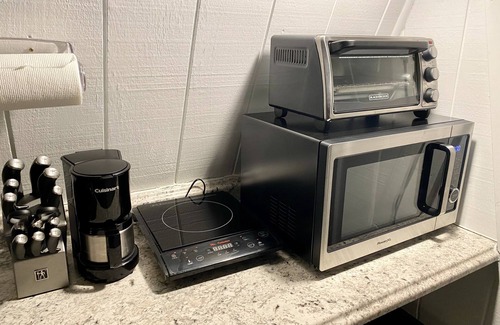 . Complete kitchen; cooking equipment includes an outdoor gas grill, and induction cooktop with Cuisine Art pots and pans, a microwave oven, a coffee maker, a toaster.