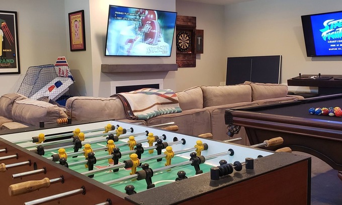 After a day of sightseeing or night on the town, you will definitely want to rest your tired feet and enjoy the outdoors in the 8 person hot tub. Maybe unwind with a glass of wine, partake in a little corn hole, Foosball, ski ball, pool table, arcade, movie by the fireplace, or darts in the game room, or sit around and relax over a bonfire. You must provide the firewood, Home Depot and Lowe's carry wood.
