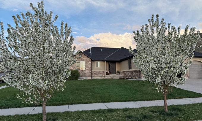 Unwind in Payson at this cozy home. Relax and enjoy the beautiful open back yard with breathtaking Moutain Views and only minutes away from downtown. This spacious home sleeps 16 people. With 4 bedrooms including a private king suite on the main level with a private bathroom and 2 private queen suites that share a bathroom. Downstairs enjoy the additional living space with a bunk room, king bed, and a private bedroom.