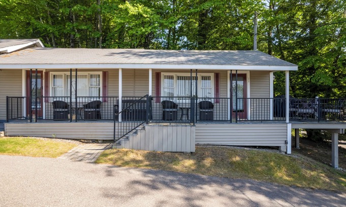 2 Condos, 1 one with queen bed and 2 twin bunk beds, other side with Queen Murphy bed and double reclining sofa. Each condo has a Full Bath with Shower! Fridge on each side, small kitchenette on bunk side and laundry on the other. (Prices are for both condos together, condos not rented separately) Very large private wrap around deck with large seating area and grill on side of end unit. Views from deck overlooking pool and Paugus Bay. Watch the boats and fireworks from your own deck! Private Beach access right across the street!