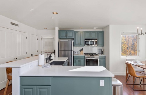 Fresh remodel! This convenient two bedroom condominium is surrounded by the majestic peaks of Colorado's San Juan Mountains with great views and super convenient access to all the activities. As you enter the residence it has an open floor plan with mountain views, allowing for welcoming conversations throughout the kitchen, dining and living area. The gas fireplace makes the living space warm and cozy. The kitchen is efficient and well equipped with a gas stove and oven and stainless steel appliances. Two guest bedrooms are located off the living area; the first guest bedroom has a queen bed and ensuite bathroom with walk-in shower and the second guest bedroom has a queen bed and a full bathroom outside the door with a step-in tub/shower. The washer and dryer are located conveniently between the bedrooms.