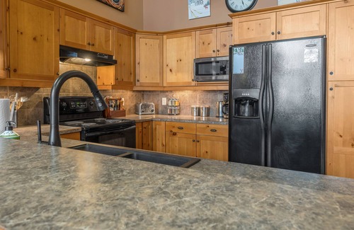 Enjoy the huge fireplace in the living room, comfortable spacious sofas overlooking the beautiful unobstructed views of the Monashee Mountains or catch up on your favorite Netflix, Telus Optik TV or DVD’s on the 59″ Flatscreen.