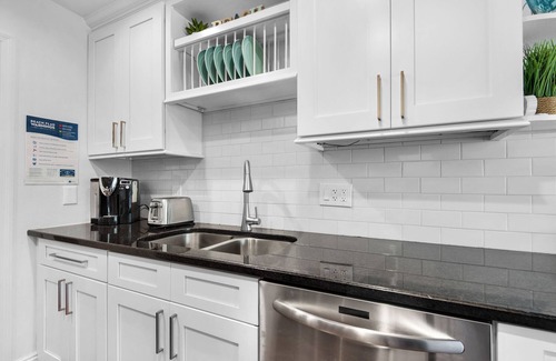 A starter set of amenities is provided, including kitchen essentials (paper towels, sponge, dish soap, dishwasher pods, wipes, trash liners, laundry pods) and bathroom supplies (toilet paper, soaps, body wash, shampoo, conditioner). Towels include one body towel and washcloth per guest, plus two hand towels per bathroom.