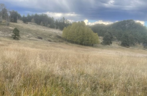 Wild flower meadow, private aspen grove and forest, in the Mountain Peaks Above Boulder. Off-grid: wood stove, dishes, water delivery, studio cabin with private porch. Cook on the wood stove, a propane grill, or outdoors on the fire grill or the BBQ!