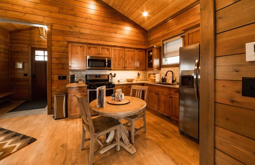 Each cabin features full kitchens, central heating and air, wood-burning fireplaces, and balconies with views.