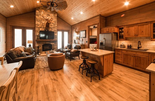 Each cabin boasts full kitchens, central heating and air, wood-burning fireplaces, and balconies with scenic views.