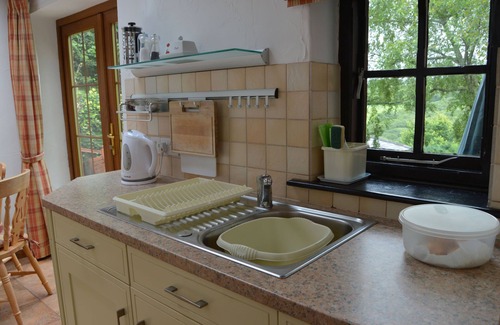 Beautiful fully fitted kitchen, cooker, fridge and microwave, with french doors onto a sun terrace and garden. Lovely views across the valley.