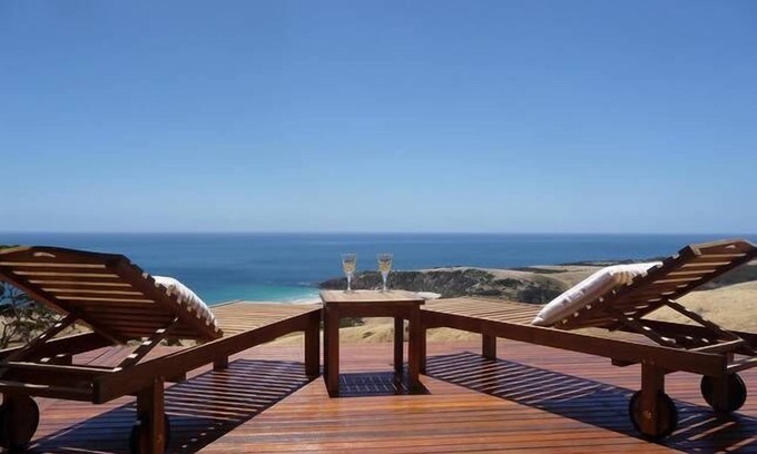 Snellings View offers two beautifully appointed homes connected by a central reception-style entrance. Snellings View is available as shared accommodation for 12, or as private facilities for 2 to 6. The spacious floor plan is ideally suited for 2 families of 6, or 4 couples. Each luxurious home contains a queen-sized master bedroom with ensuite, and a second bedroom with queen sized bed, single bed with trundle, and private ensuite. Guests at Snellings View can enjoy exquisite uninterrupted views of Kangaroo Island’s pristine coastline whilst taking advantage of the spacious and fully appointed open plan living, dining and kitchen area, which is equipped with modern stainless steel appliances and superbly finished with natural timber flooring. Bathrooms featuring Italian fittings and limestone floors provide the perfect space for relaxation. Snellings View boasts ultra modern design complimented by beautiful furnishings and travertine feature walls, and both homes have a comprehensive entertainment system with television and DVD player. Outdoors, guests can soak up stunning 180-degree views of the coast and hinterland whilst enjoying a barbeque in the private outdoor entertainment area, or admire the warm and sheltered Snellings beach (located just 1km from the property) from surrounding verandahs.