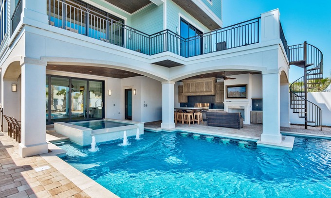 With ten bedrooms spread across this beach retreat, this home is a Frangista Beach dream with a private pool, multiple porch levels where everyone can congregate, and a variety of spaces made for games or group activities. The indoors boast a first and fourth floor game room, a dining table for 16, and a 5th story observation deck where you can watch the sun go down. But with the humid temps in Florida, you’ll likely be spending most of your time outdoors in the pool. There’s also a hot tub attached to the pool, and we see no reason why you shouldn’t pamper yourself with both on your vacation to relax and unwind.