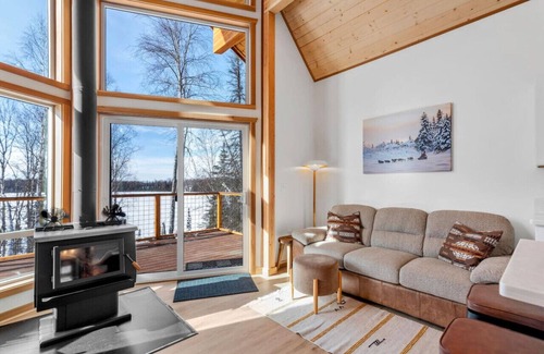 You`ll enter Sojourn Cabin through an arctic entry, and into the main open concept living space with prow windows. Immediately to your right, you`ll find the kitchen and beyond that the living room with a wood stove at its center. You`ll find a two different seating areas, a smart TV with Netflix, Hulu, and Disney+, and a variety of Alaskan themed books. The windows make the living room feel bright and spacious, and offer the opportunity for bird watching in the summer, and star gazing in the winter. You can also enter the deck from the living room, where you can sit and relax. Occasionally, you may be lucky enough to see the northern lights out the window, a moose sighting, or one of the local dog teams training down below.