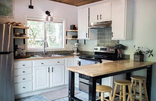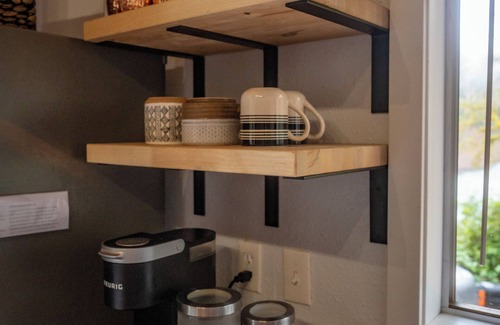 Kitchen: Fully equipped with a refrigerator, Keurig coffee maker, bar seating, and all the cookware, bakeware, plates, and utensils you need for home-cooked meals.