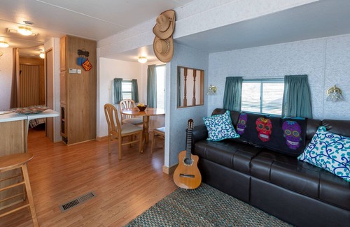 ALMA Ranch is a unique property, located on Terlingua Ranch, just 4 miles from Terlingua Ranch Lodge, The Bad Rabbitt Cafe and pool. This trailer is beyond comfortable and has all the comforts of home, with electricity, AC/heat and a septic system (which means flushable toilets). The kitchen is fully stocked, including a full size refridgerator, stove, microwave and coffee maker. We provide some drinking water to ger you started and coffee. It is nestled in the mountains and provides view as far as the eye can see. The night sky is amazing. Stars forever.