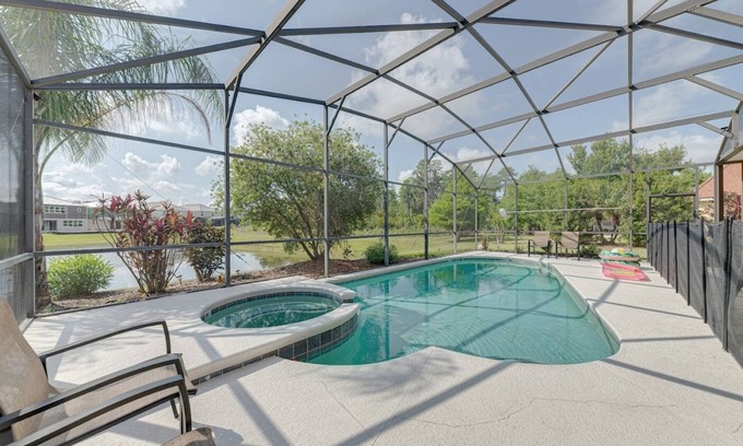 An extended lanai all screened in for your entertainment or to just relax with nature. This magnificent pool is south facing for all day long sunshine and has a pond conservation view with NO REAR NEIGHBORS! Sun loungers and dining table with chairs are also provided.