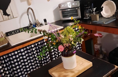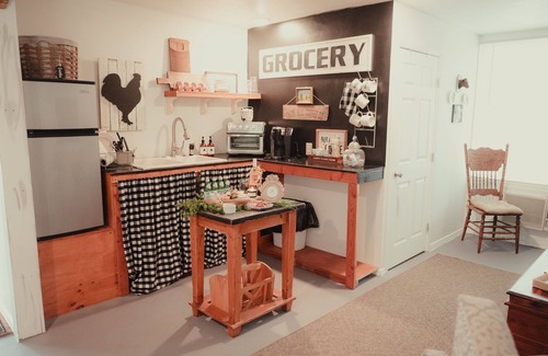 Sleeps 7 BUT ONLY ONE bathroom so 5 is better!) liv room, dining space, bath, kitchenette with countertop oven/toaster & airfryer!! NON-smoking. Wifi. Firepit. Cornhole.