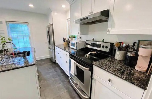 The fully stocked kitchen boasts an island and a brand new luxury refrigerator. You'll find all the necessary cooking essentials for preparing delicious meals during your stay. Don't forget to enjoy a cup of coffee using the provided coffee maker and coffee pods.