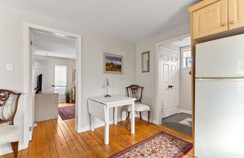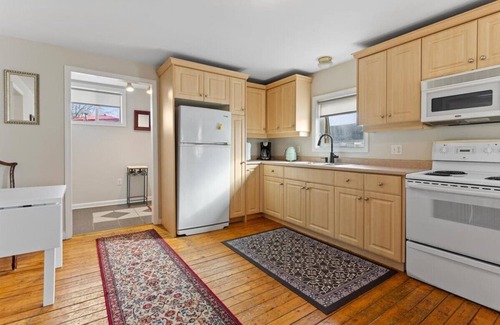 Good karma and rich history in this fully equipped 2 bedroom second floor apartment. Private deck, ample parking and green space, laundry room not in the apartment, large and bright, pine floors throughout, fully equiped kitchen, public transit close by, grocery store, public park, library and liquor store within walking distance.