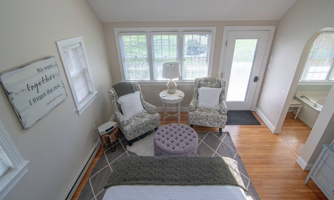 The Cottage is a one room beauty featuring unique architecture and skylights letting in the natural light. It overlooks our flower gardens. There is a comfortable Queen size bed, sitting area and mini kitchenette with mini fridge, microwave, tea kettle and Keurig coffee pot. We do not have TV as we would rather you focus on connection. There is AC, hot spot WiFi and a Bose sound system w/CD player. You will also find a Lyric Massage Gun for your relaxation benefit.
