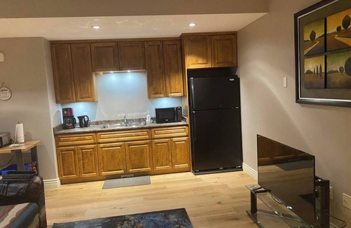 The kitchenette has a double sink, kettle, coffee maker, microwave and Ninja air fryer (acts as an efficient small oven, toaster, and dehydrator, among other things… see photos or Google). There is a large fridge with a freezer in the kitchenette, and a small fridge with a tiny freezer in the ‘mud room’.
