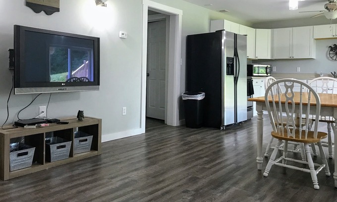 The open concept living area of this open concept apartment has a beautiful view of the Catskill Mountains. People stop near this house to take pictures because the location can't be beat. One of the best views in the Hudson Valley. With two bedrooms and a pull-out sofa in the living room, 6 people can sleep comfortably in the space.