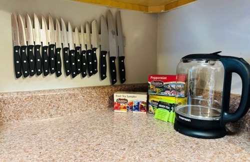 After dinner blended cocktails? We've supplied the blender, with drinking glasses or plastic cups. And enjoy them in the comfortable living room, or on the rear patio furniture out back.