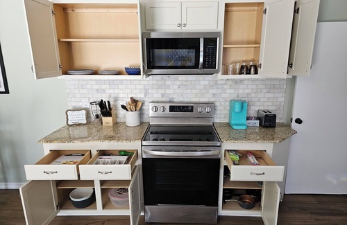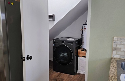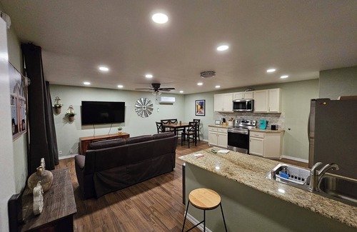 Experience Bakersfield like a local in this superb 1-bedroom 1150sqft backhouse on a 1/2 acre. The cozy upstairs bedroom features two queen beds, perfect for a good night's sleep. Relax in the living room with a comfy sofa bed for additional guests. Enjoy amenities like AC, heating, WiFi, 60" smart TVs, full size fridge, microwave, dishwasher, and a washer/dryer machine. Our place is fully furnished for both long or short stays to make your holiday one to remember. Our guests are welcome to use the pool, kids outdoor playset, and basketball court.