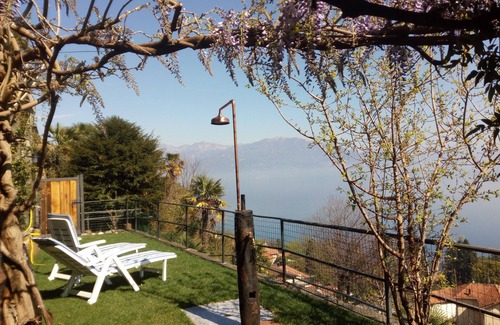 The attractive 3½-room apartment is located on the ground floor of a neat 2-family house in a quiet and sunny view, slightly above the lake. In total, the tastefully furnished apartment has a living area of approx. 100 m², a garden of approx. 120 m², a balcony of approx. 10 m² and a terrace of approx. 8 m². From the inside as well as from the outside you can enjoy a wonderful view of the lake and the opposite mountains. The public beach as well as the ship dock are about 1.5 km away, so you can reach many excursion destinations also by the passenger ferry. In the village of Gonte, just 1 km away, there is a grocery store as well as a pharmacy, a doctor, a restaurant and a pizzeria with a very nice view. Oggebbio and its surroundings can be explored on footpaths through endless chestnut and beech forests. You will always surprise impressive viewpoints with constantly changing views on the exceptionally beautiful landscape and the lake. For passionate golfers there are five greens with different requirements within 15 to 30 minutes. If you are still longing for the digital world, you have a free WLAN Internet access available for surfing the Internet. You park your car in the car park within the enclosed property. Living room with satellite TV, fireplace, dream view and exit to the balcony Large, well equipped separate kitchen with dishwasher, 5-burner gas stove, oven, satellite TV and beautiful sea view Storage room with washing machine Bedroom with double bed (single mattresses: 0,8 mx 1,9 m), beautiful sea view and exit to the balcony 2. Bedroom with 2 single beds, which can also be placed side by side (mattresses each 0.8 m x 1.9 m), and magical lake view Friendly bathroom with sink, bidet, bathtub and window 2nd friendly bathroom with shower and window Approx. 10 m² large balcony with a gigantic view of the lake and the mountains Ca. 8 m² large covered terrace with gigantic view of the lake and the mountains In front of the apartment about 120 m² large enclosed sun garden with barbecue, outdoor shower and beautiful views of the lake and the mountains
