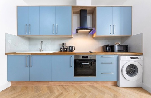 The kitchen is equipped with all the essentials needed to cook an array of meals whilst away in London. There is a hob, oven, fridge freezer, microwave, dishwasher, washing machine & heated clothes rail.