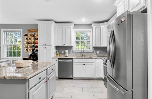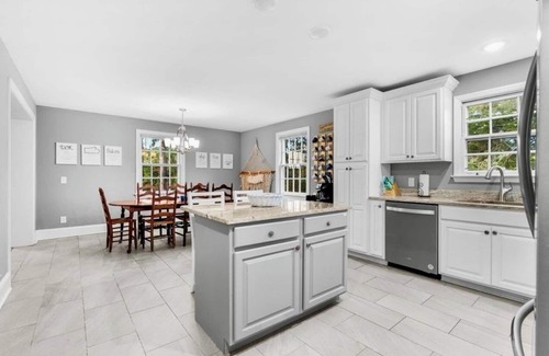 This superb house in Clarksville sleeps 15 and boasts 4 bedrooms, including 3 queen beds, 2 twin beds, bunk beds with a 3rd pull out trundle and a sofa for the little ones, and even a pack and play with a chair and white noise machine for new mom or dads. With 4 bathrooms equipped with hair dryers and showers, guests will feel right at home. The welcoming living rooms offer additional sleeping space with 3 cozy sofas. With 2 dining tables as well as a kitchen island, you’ll be able to sit down and enjoy family meals with plenty of seating space. Sit on the screened porch with a cup of coffee and watch the sunrise or enjoy a refreshing beverage on the back patio. There’s even a game room in the basement with shuffleboard, basketball, ping pong, air hockey and more. There’s also a closet stocked with all kinds of board games and puzzles for the whole family to enjoy. Relax in the hammock with a good book while the kiddos play on the swing set nearby. There’s corn hole, and kayaks, a paddle board as well as a small fire ring and chairs for yummy s’mores in the evenings. Make your time away one for the books with a stay at our place.