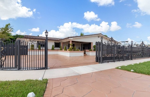 Bring the whole family to this cozy, fully gated corner house in Hialeah with ample indoor and outdoor space. Fully equipped with a tiki hut, outdoor kitchen, game room with pool table, pool, and a fire pit. Just a short 15 minute drive from the airport and 20 minutes from the beach.