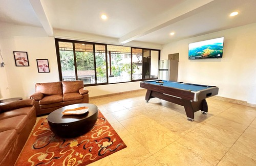 This large beautiful house is located in the Escazu mountain in a peaceful neighborhood surrounded by trees and looking out over the central valley. 5 bedrooms (4 with air conditioning), 3 with their own full bathrooms and 2 sharing a bathroom. Plenty of space and stuff for everyone to do. Amenities include: heated pool, sauna, large deck, fire pit, basketball area, game room, and gym. There is a large kitchen and common areas are spacious.