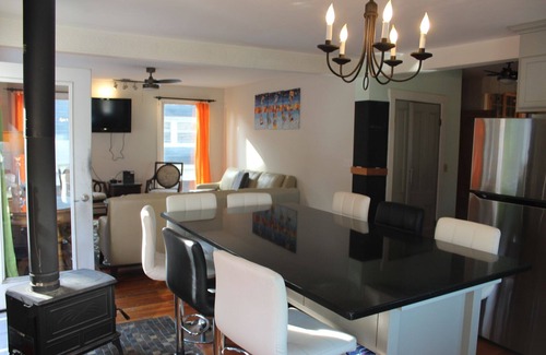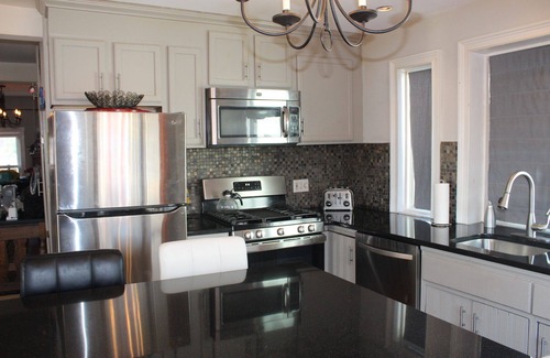 The remodeled kitchen has granite counters and an island with stools for gatherings. There are stainless steel appliances, and the house comes fully furnished including dishes, glassware & utensils, pots & pans, as well as a mcrowave, blender, toaster, and coffee maker. The dining room has a large table that comfortably seats 8.