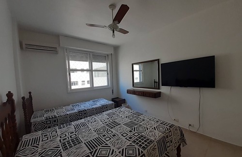 The apartment has two bedrooms plus a bedroom and a bathroom, large living room with two rooms, kitchen and complete service area, including maid's. With wi-fi, air conditioning and ceiling fans in all environments. Sleeps up to eight people in comfort. It is on the 10th floor, providing beautiful views of the sea. Private elevator. Building with swimming pool and a place marked in the garage.