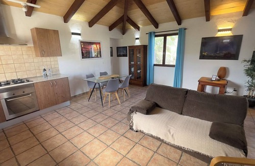 • Living room with a sofa and two armchairs, Smart TV connected to the internet with access to Netflix.