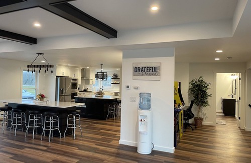 There is one private master suite with an additional hideaway bed. The lower level has a queen sized bed and a queen sized Murphy Bed. Plenty of space to blow up the air mattress that is included. The main living space has a sofa that pulls out into a double bed. All extra bedding and pillows are available. There are two full baths and two half baths.