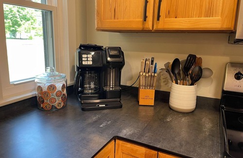 - Coffee & tea station (drip coffee maker, Keurig with K-cups, hot water kettle, variety of tea bags)