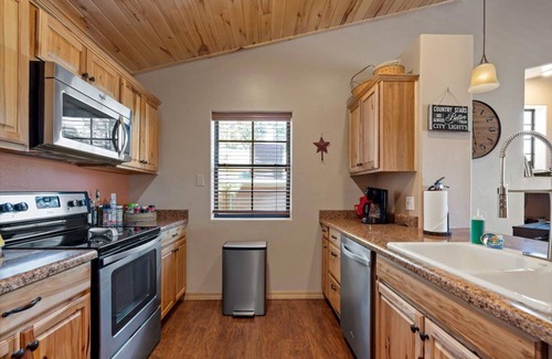 Experience cooler temperatures in summer and snow in winter at an elevation of 6800ft, with unobstructed south and southeast views for miles. Our quiet cabin is located in Bison Ranch, and backs up to Apache-Sitgreaves National Forest. You'll enjoy modern comforts like AC, high-speed WiFi, and streaming TV, along with well-equipped kitchen, gas grill, outdoor dining table, and games for a fun-filled stay.