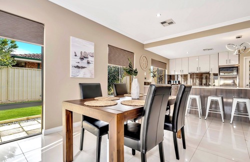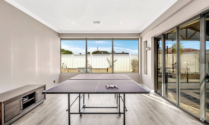 Discover spacious coastal living in Safety Bay with this charming 4-bedroom home. Coastal-themed decor and inviting accents create a warm ambiance. You'll find two and a half luxurious bathrooms for added convenience. Outside, an inviting pool area offers relaxation and fun. The home features a games room with a pool table and table tennis for entertainment. Enjoy air conditioning, laundry facilities, and Wi-Fi for a comfortable stay.