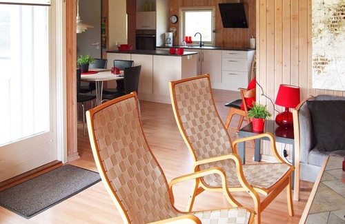 Layout: open kitchen(cooker(electric), coffee machine, microwave, dishwasher, fridge(+ freezer)), Living/bed room(TV(satellite, german television channels, danish TV channels (DR1 and TV2)), DVD player, CD player, stereo unit), bedroom(double bed), bedroom(2x single bed), bedroom(double bed), bathroom(floor heating)(bathtub or shower, washbasin, toilet, washing machine), heating(electric), terrace(roofed), garden furniture, air to air heatpump
