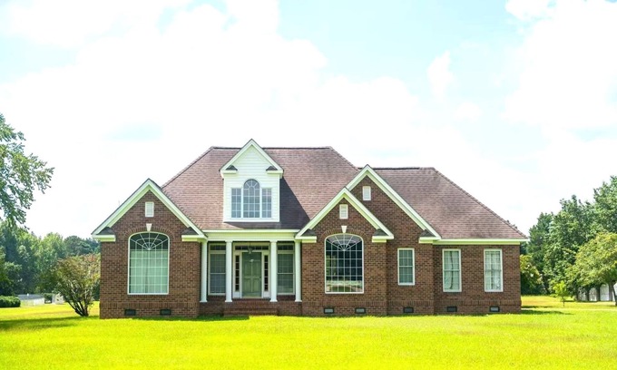 Welcome to your peaceful getaway! This charming brick home features a bright and spacious living room with cozy sofas, floral rugs, and hardwood floors, a fully equipped kitchen for home-cooked meals, and comfortable bedrooms for restful nights. Enjoy the private study with an arched window and bookshelves, or step outside to a wide green lawn with grapevines and open views. Perfect for families, friends, or remote workers, this home blends comfort, style, and tranquility for an unforgettable stay.