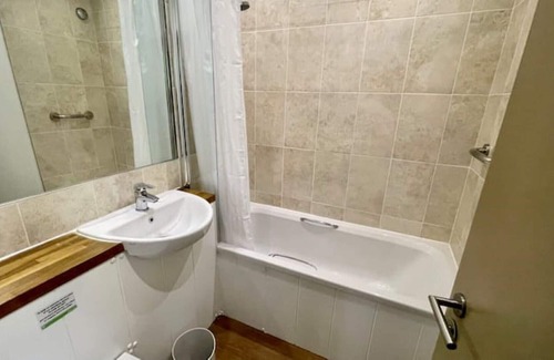 The main bathroom is well-appointed, featuring a bath with an overhead shower, a vanity mirror, a toilet, a washing basin, and a chrome towel rail. Fresh luxury hand and bath towels are provided for all guests upon arrival.