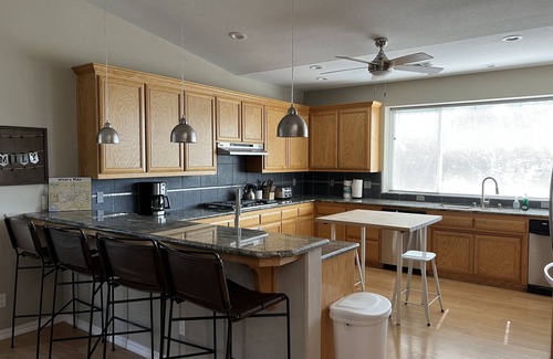 This over 3000 square foot home features four bedrooms and three bathrooms sleeping up to 12. With this spacious home you will find a great driveway for parking even a large boat. From the driveway your vacation begins as you go up the steps to a large entertaining deck to the entry door where you will spend much time enjoying your favorite beverages. Entering the home you walk through the foyer to the large living room that boasts a large Smart TV with Wi Fi so make sure to have your Netflix, Hulu etc. passwords. There are two A/C and heating unit to keep you comfortable during your stay, along with a whole house fan. To the right of the living room is the dining area and kitchen. The gourmet kitchen has granite countertops with two separate sinks, refrigerator with ice maker, stove, double ovens, microwave, dishwasher, coffee maker, pots, pans, dishware, glassware, and utensils for twelve. There is a patio directly off the kitchen with your propane BBQ for outdoor grilling. Down the hall off the living room you will find a large master bedroom with a Cal king bed and en-suite bathroom that has a separate shower, jetted tub, and dual sinks. On the other side of the hall there are two more bedrooms and the laundry room. The first guest bedroom has a queen bed and the second guest bedroom has a Cal King bed with an adjacent shared bathroom with a shower. Back towards the living room there are stairs that lead down to the lower level forth bedroom with two bunk beds with twin bunks on the top and queen beds on the bottom. There is also a bathroom with shower on this level. This home provides plenty of space for you, your friends, and family to have a memorable vacation. It’s also very convenient for lake access being close to the West Ramp launch and beach area.