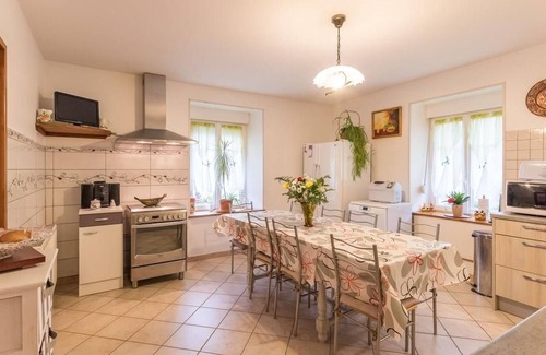A large gîte with every comfort, ideal for families, friends, and more. Relax with peace of mind: all-inclusive prices: utilities and heating, bed linens, and towels. In a small village near the spa town of Luxeuil-Les-Bains, a large gîte located in a detached house comprises, on the ground floor: veranda, entrance hall with relaxation area, equipped kitchen (American-style fridge-freezer), TV lounge with DVD player, dining room with stove, bathroom (shower), and toilet.