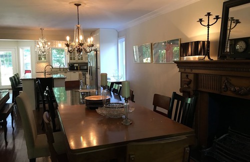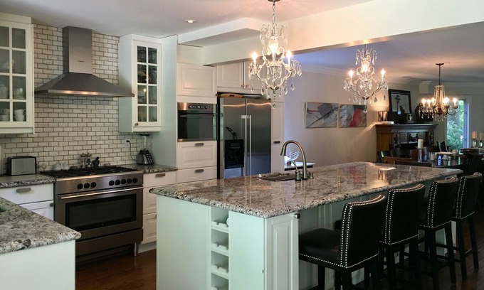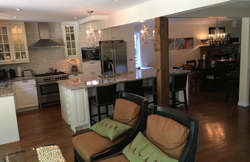 Relax to the sounds of the waves from this stylish Toronto home located on a quiet dead end street right across from Lake Ontario. Contact host for short term availability. This property is very accessible to the cities waterfront walking and biking trail. This hidden enclave of historical and unique family homes, on the Scarborough Bluffs, is only 20 minutes from downtown and 10 mins. to the Film District. The property is 3500 sq. feet, and is decorated in a sleek comfortable modern decor. It offers 5 bedrooms, 3 full baths and a 4th powder room. Hardwood floors gleam throughout the main level and many windows and French doors, offer lots of natural light. This property offers self-check-in and keyless entry and is professionally cleaned and sanitized between changeovers. If you are looking for a shorter term please contact the owner. The main levels' floor plan allows for a perfect expansive entertainment area while still accommodating gatherings that are more intimate. A designer French bistro style kitchen with an enormous 10-foot granite island is the hub of the main floor living area. The new kitchen is equipped with a 36” gas five burner stove/oven, built in microwave, double door fridge and 5 comfortable leather stools surrounding the island lit by 2 chandeliers. Adjacent to the kitchen is a expansive family room with soaring two story ceilings ,a gas fireplace flanked by two couches, and 2 sets of french doors exiting to the landscaped gardens. The main floor laundry area leads to the double attached garage.