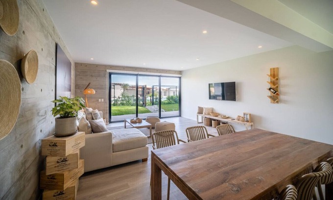 The open-kitchen living area is designed for seamless gatherings, while the outdoor charcoal BBQ is great for delightful cookouts (parrillas).