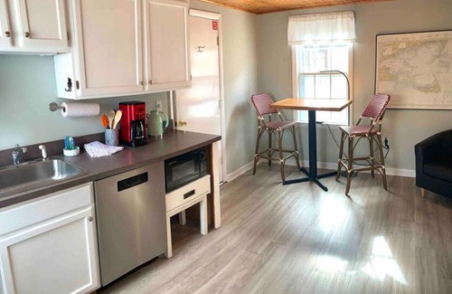 This spacious studio guest house is tucked away behind an historic sea captain's house. It has a cathedral ceiling, a private entrance, outdoor seating, central AC, eat-in kitchen, wifi, and Roku television.