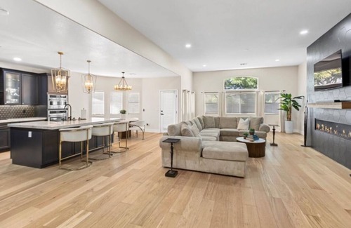 Has gorgeous wood flooring throughout, along with high-end furniture, an alarm system, a custom 12-foot accent wall with a mantle, 72-inch gas fireplace, and a huge free-standing tub with a custom rain shower which makes it a luxurious home. The countertops are made of leathered Taj Mahal, giving it a unique and elegant look. The 42 inch cabinets are charcoal gray with gold knobs. Entire Kitchen was recently renovated along with the backyard.