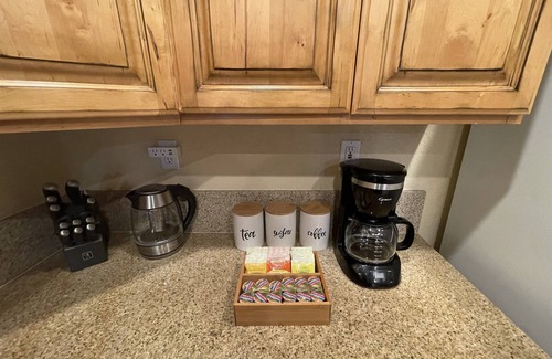 A large kitchen with lots of counter space and fully-equipped for your cooking needs. Complementary coffee, tea and sugar provided.